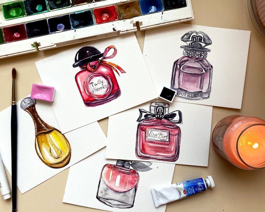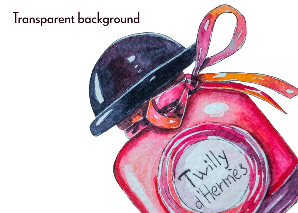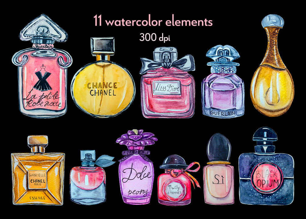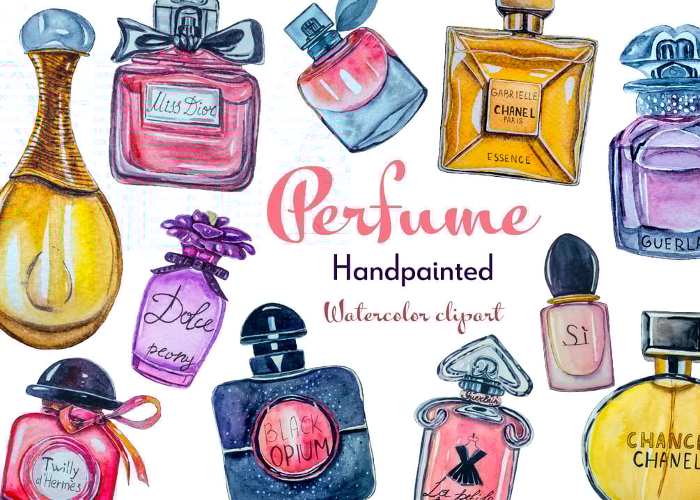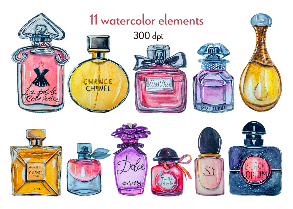 “Perfume” watercolor clipart set includes 11 handpainted watercolor elements.