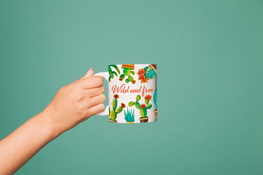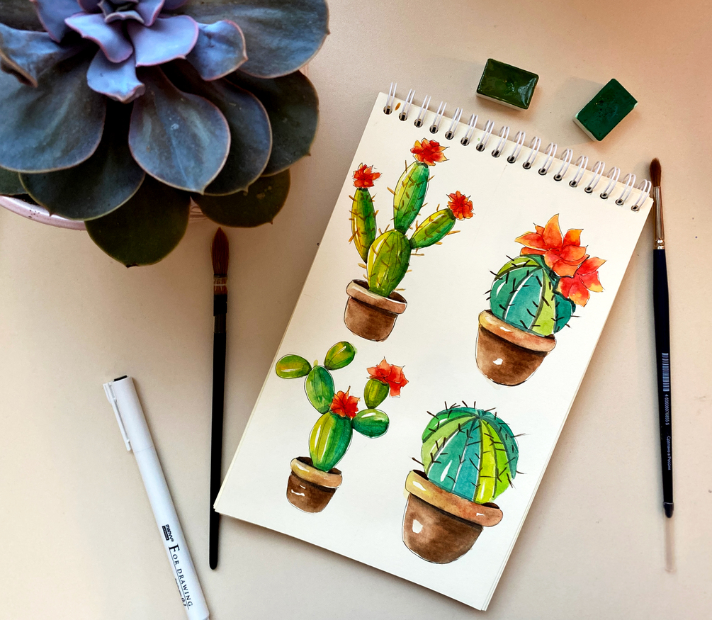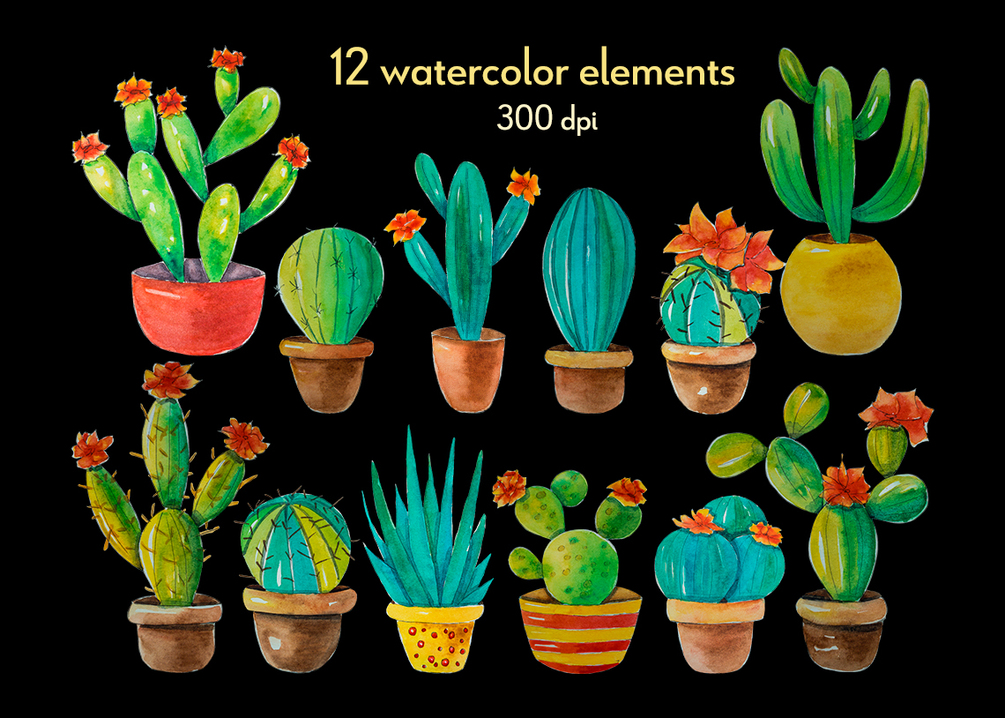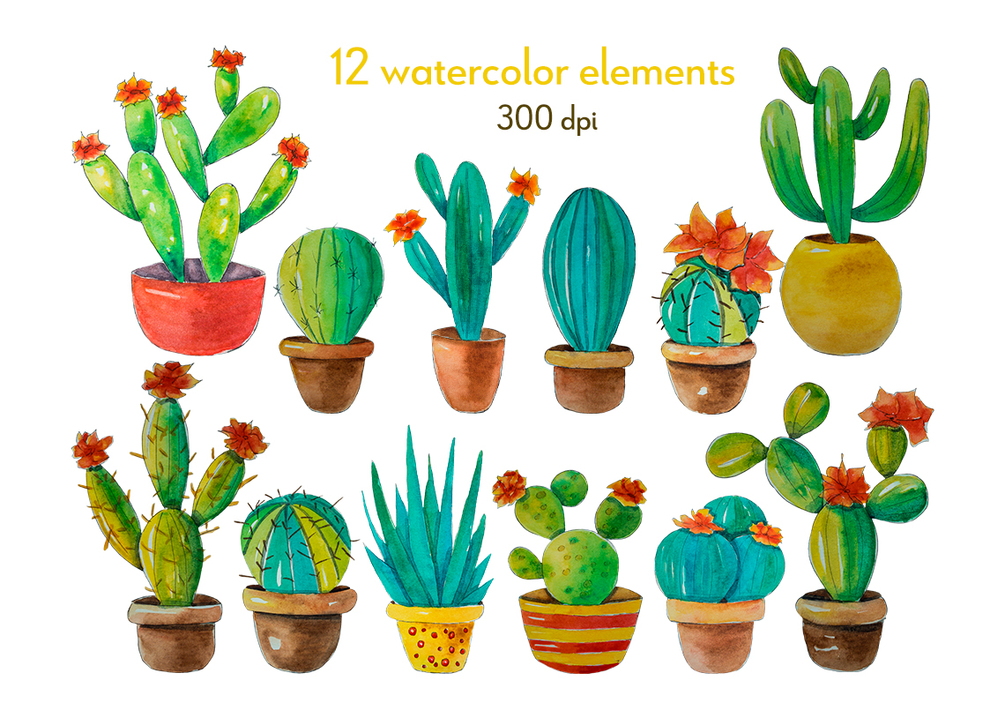 “Cactus” watercolor clipart set includes 12 handpainted watercolor elements.